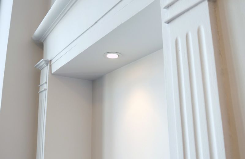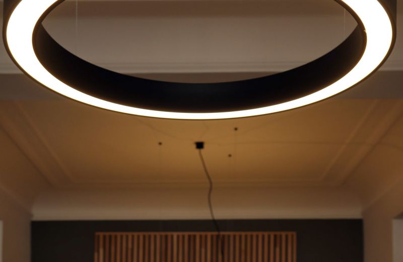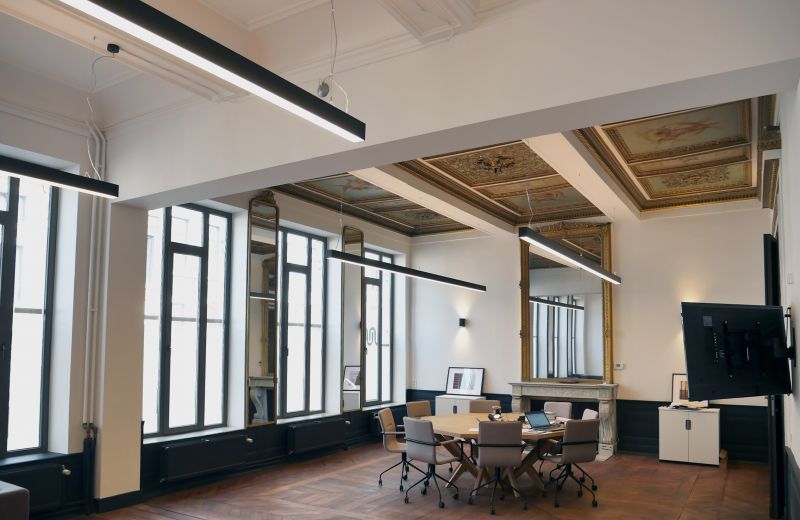 Placement de suspensions sous forme de profilés LED dans les bureaux et placement d’appliques et de luminaires modernes dans les communs.
